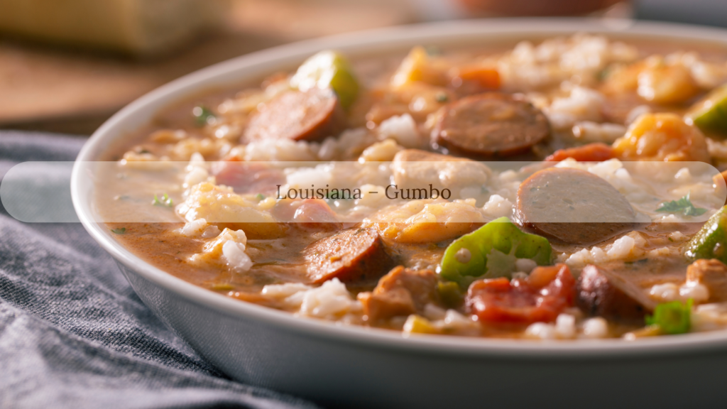 A Traditional American Dishes that perfectly represents the flavors of Louisiana, gumbo is a thick, flavorful stew packed with meats, seafood, and the “Holy Trinity” of onions, bell peppers, and celery.